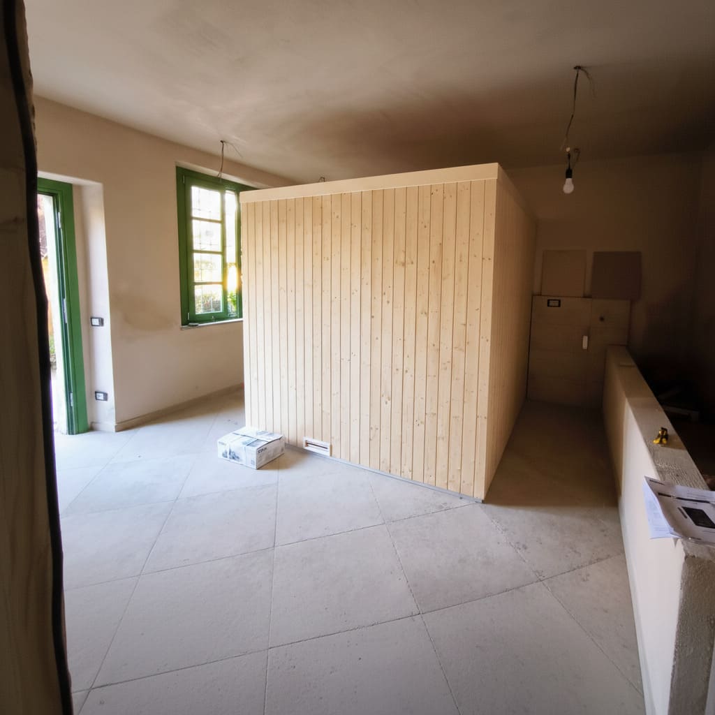 Rivestimenti e Finiture Le pareti interne sono rivestite in abete nordico di prima qualità, mentre le panche su due livelli disposte a “L” sono realizzate in legno alder con doghe strette, garantendo comfort ottimale e durabilità nel tempo.