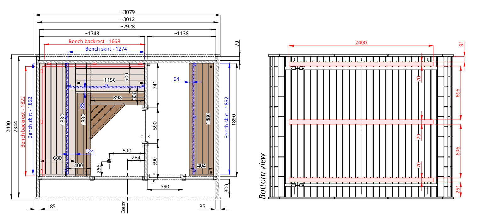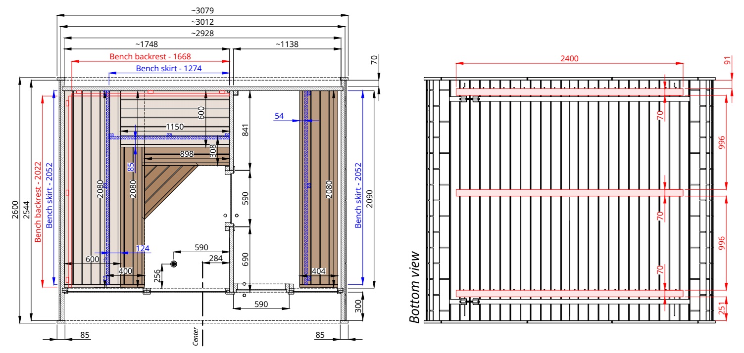 Le pareti esterne sono realizzate in pregiato Thermowood® (pino termotrattato) da 40 mm, un materiale eccezionalmente stabile e resistente all'umidità. Le panche interne sono in legno di pioppo tremulo (aspen) o ontano, scelti perché non si surriscaldano eccessivamente e non rilasciano resina.