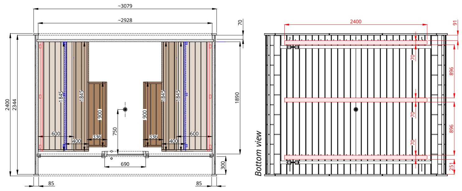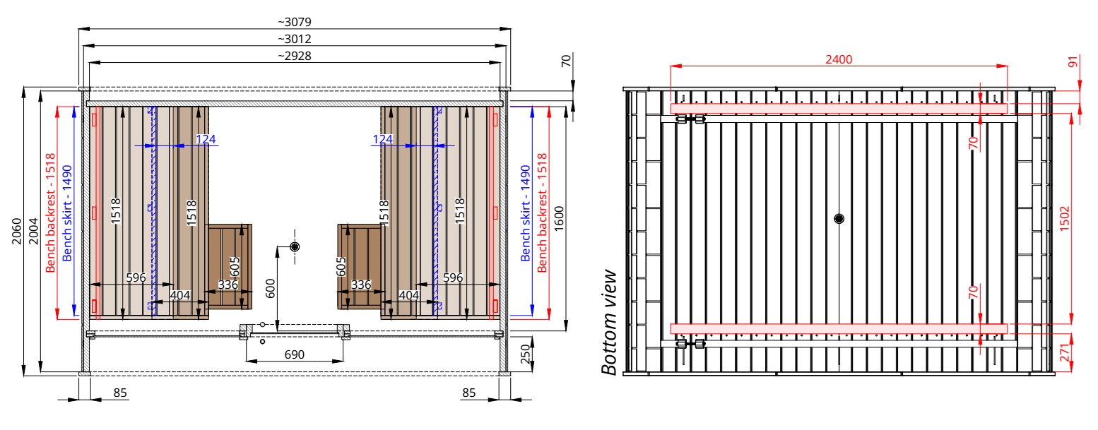 • Versione B: frontale vetrato solo nella parte sauna