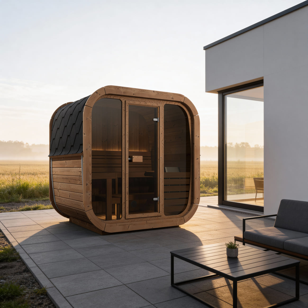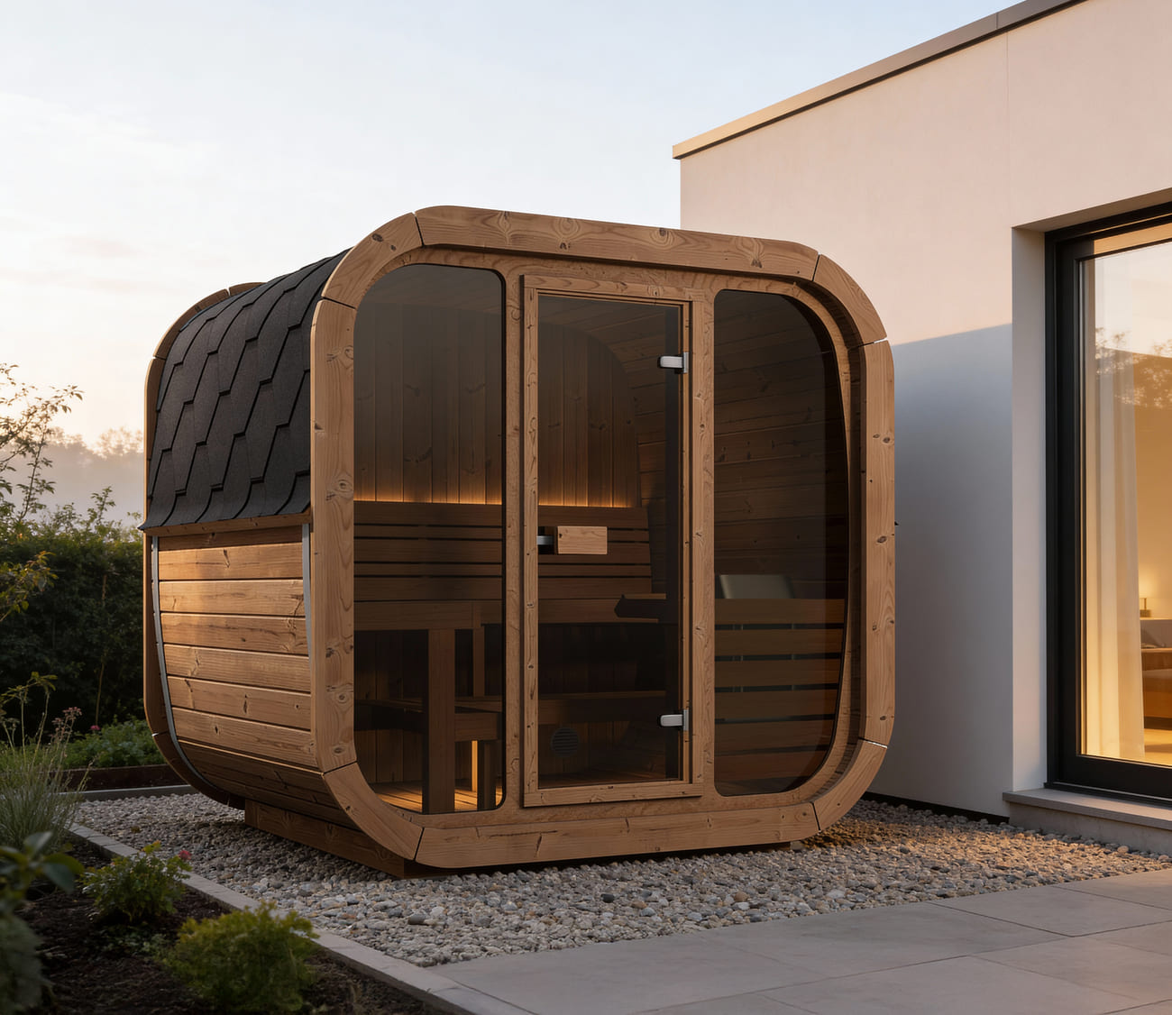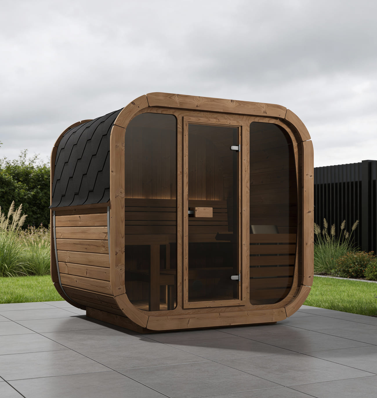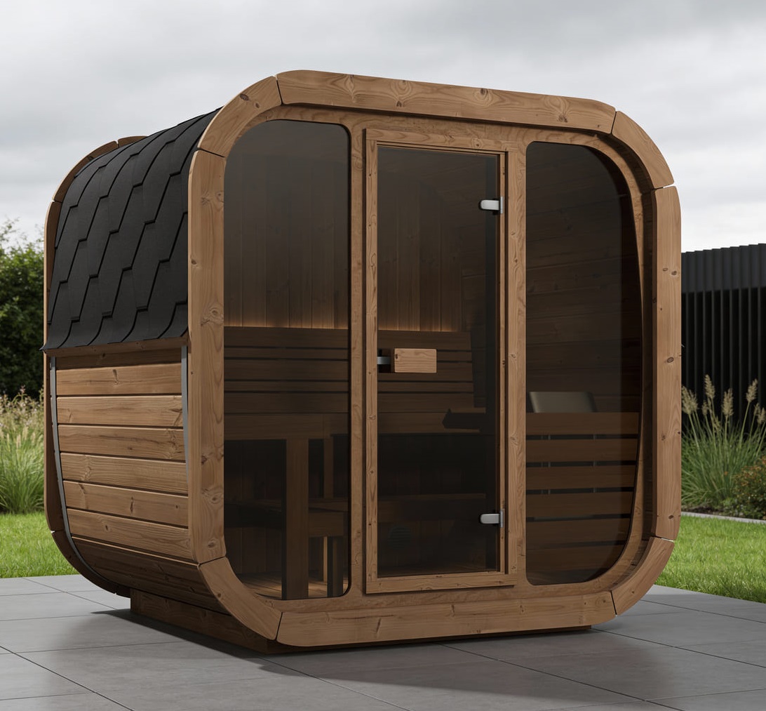 Realizzate con legno di abete nordico naturale o termo-trattato, le saune Ice Cube Lux presentano una struttura robusta e duratura, garantendo un’armonia perfetta con l’ambiente circostante. Il tetto, elegantemente rivestito con tegole canadesi, non solo aggiunge un tocco di classe, ma protegge anche la tua sauna dagli agenti atmosferici.