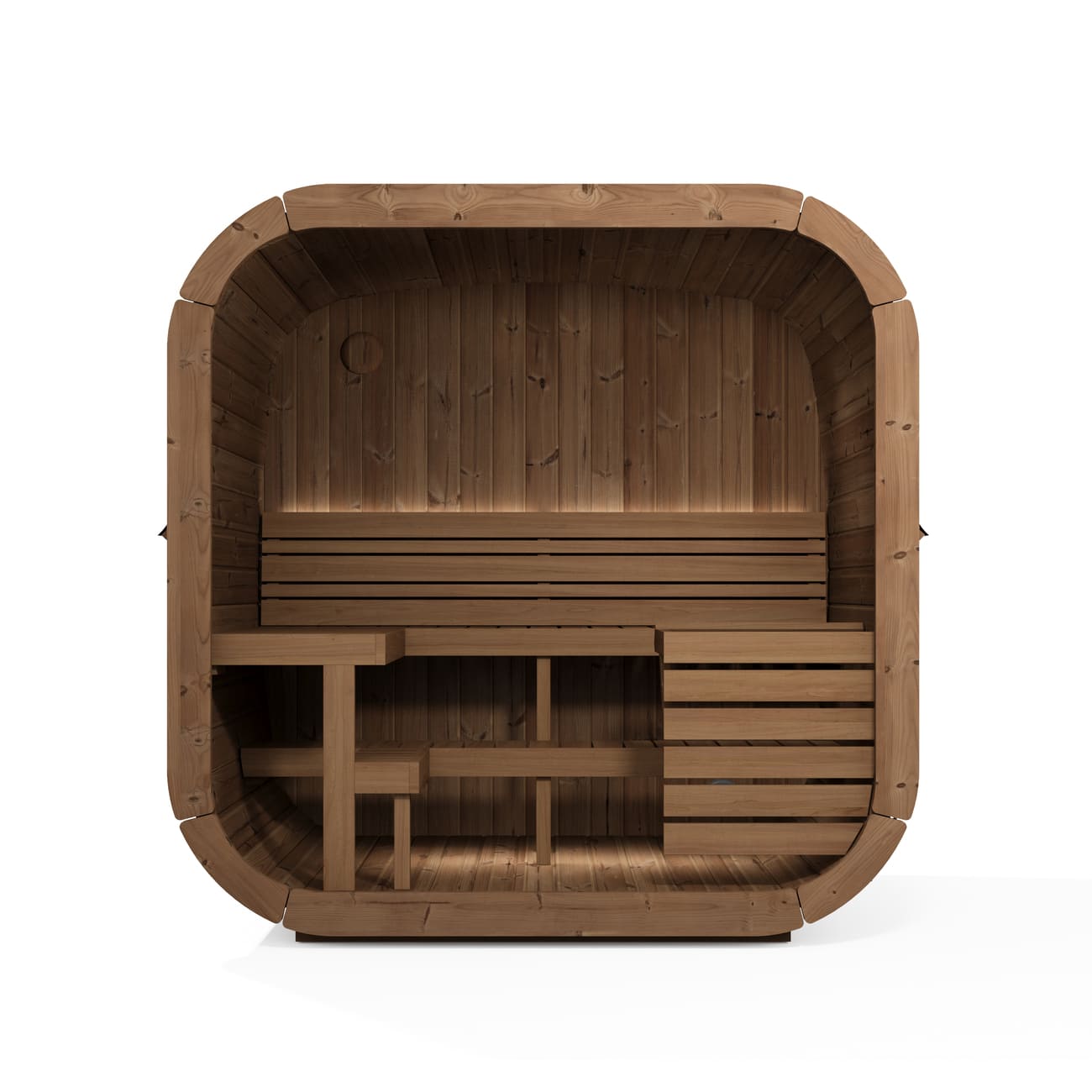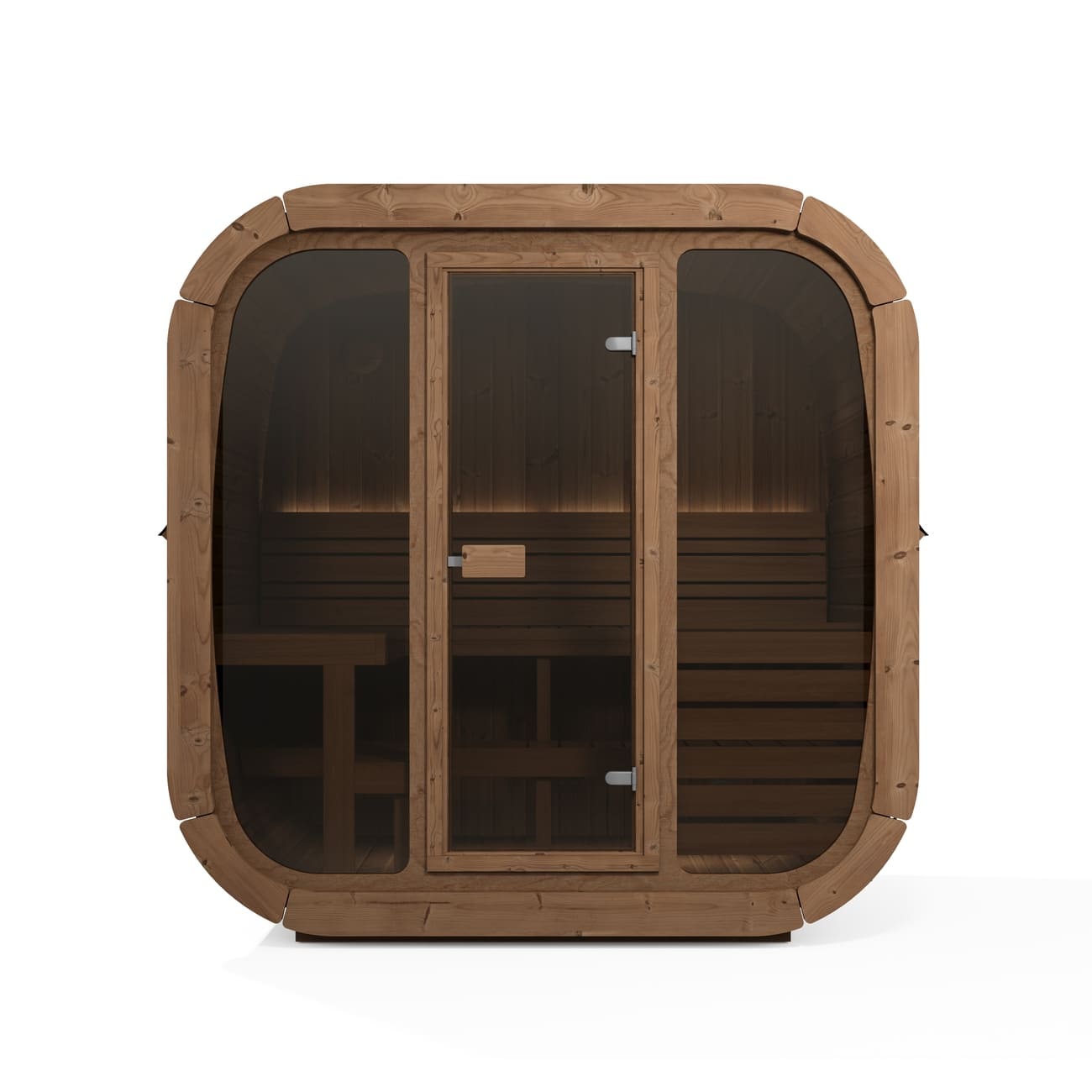 Le ampie vetrate in vetro temprato leggermente ambrato donano luminosità all’interno della sauna. Vetrate posteriori sono anche disponibili su richiesta, permettendoti di personalizzare ulteriormente la tua sauna.
